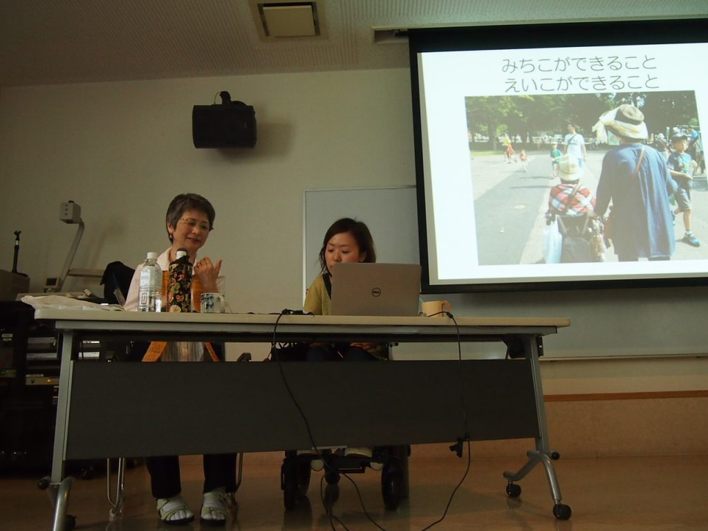 約80名の来てくださった。福祉・医療関係、大学生や大学教員、コピーライター、芸術関係、その他色々な職種の方、親御さんや子どもさん、障害のある子どもさんから大人まで幅広い年齢層だ。車いすユーザーも多かったため、100名用の大会議室が満杯になった。真夏の時期だったため、窓は前回に開けていたが、熱気がすごかった。