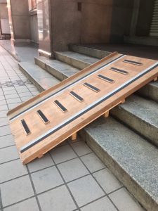 黒い線の内側に車いすを走らせ、しかも後ろで車いすを押す人も滑らないように、真ん中に足をかけるところがあります。